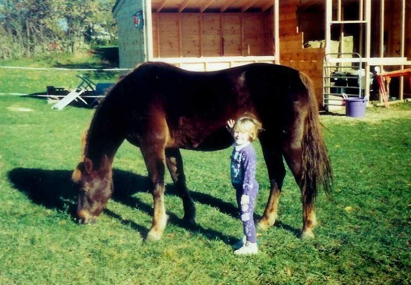 At the age of 30, I met and married my husband, Peter Derbyshire. The following year I left all of my teaching jobs to raise our children Lily and Myles. When Lily was 3 and Myles 9 years old, we purchased our home in Adamsville which sat on just over 2 acres of land. Two acres of fields! I thought to myself, “Maybe I can buy a horse someday, maybe in ten years.” The October of that very year 1995, one thing led to another and I purchased my very first horse, Topaz. I was 35, she was 17. She was an energetic mare, very head shy at first, but very well trained and she loved to jump! Peter built me half a barn: one large stall and one small for tack and grain. It all seemed like such a dream. I remember sitting with Lily, then 3, on the framework of the barn saying, “Remember this day Lil, this is a dream mommy has had since she was a little girl, and it is now coming true.”